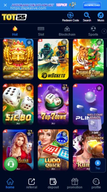 TOT55 apk gives you variety of games to play and earn real cash.